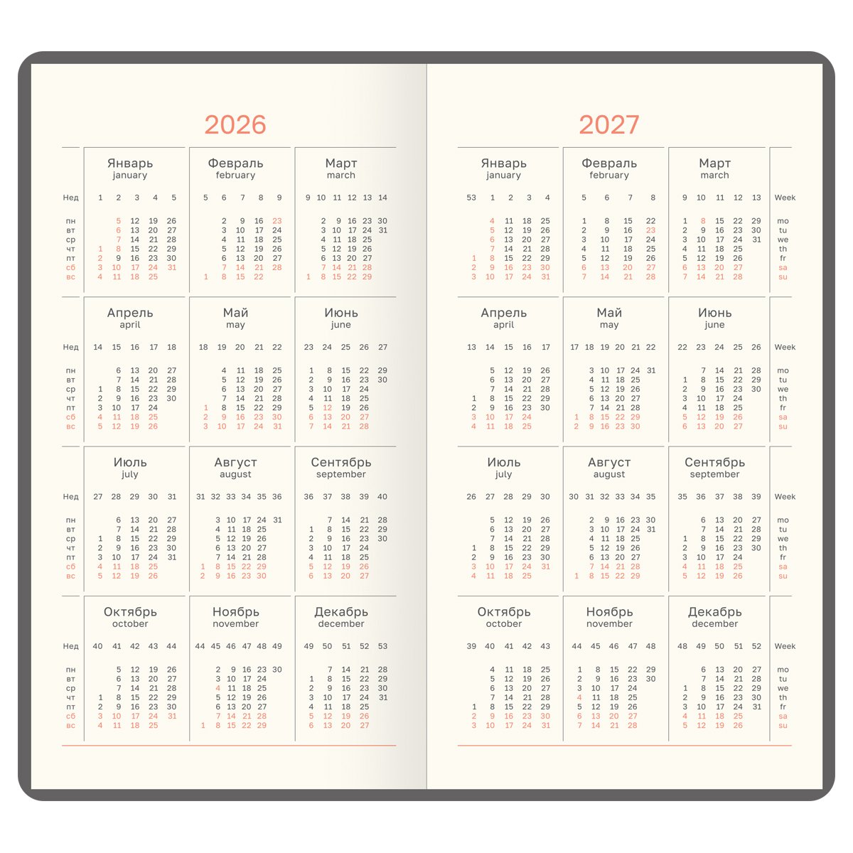 Планирование недели становится проще, когда вся информация доступна на одном развороте. Элегантная закладка обеспечивает быстрый доступ к нужной странице. Содержит календарь на 2 года, листы для записи контактов, заметок и зарисовок. Индивидуальная упаковка гарантирует его сохранность.