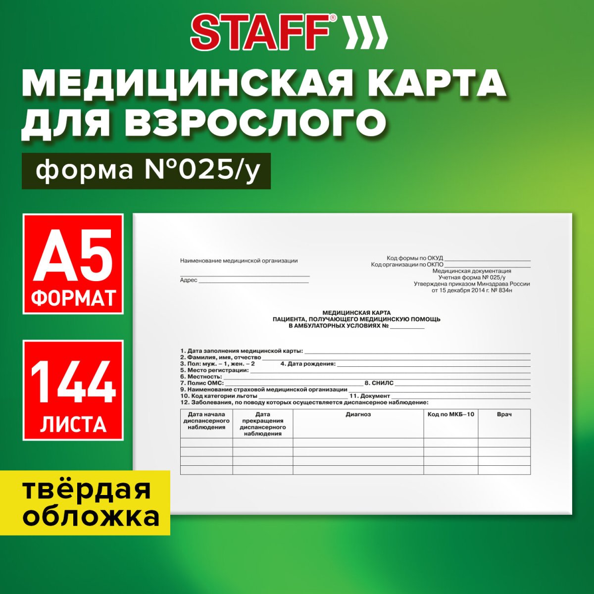Медицинская карта для взрослого форма №025/у, 144 л., твердая, А5 (218х153 мм), STAFF, 130295