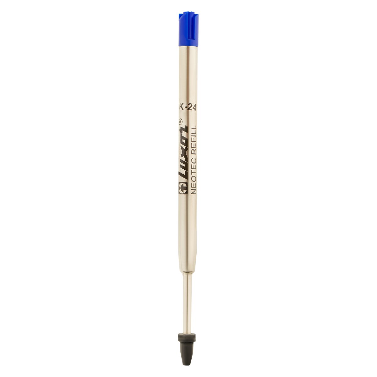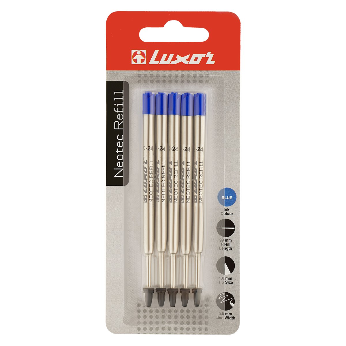 Набор объёмных стержней для шариковых ручек Luxor с кнопочным механизмом. Цвет чернил – синий. Диаметр пишущего узла – 1 мм. Длина стержня составляет 99 мм. Длина письма может достигать 700 метров. Стержни для автоматической ручки упакованы в блистер по 5 штук.