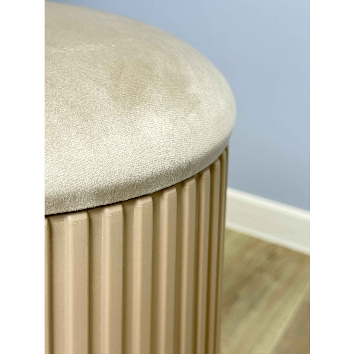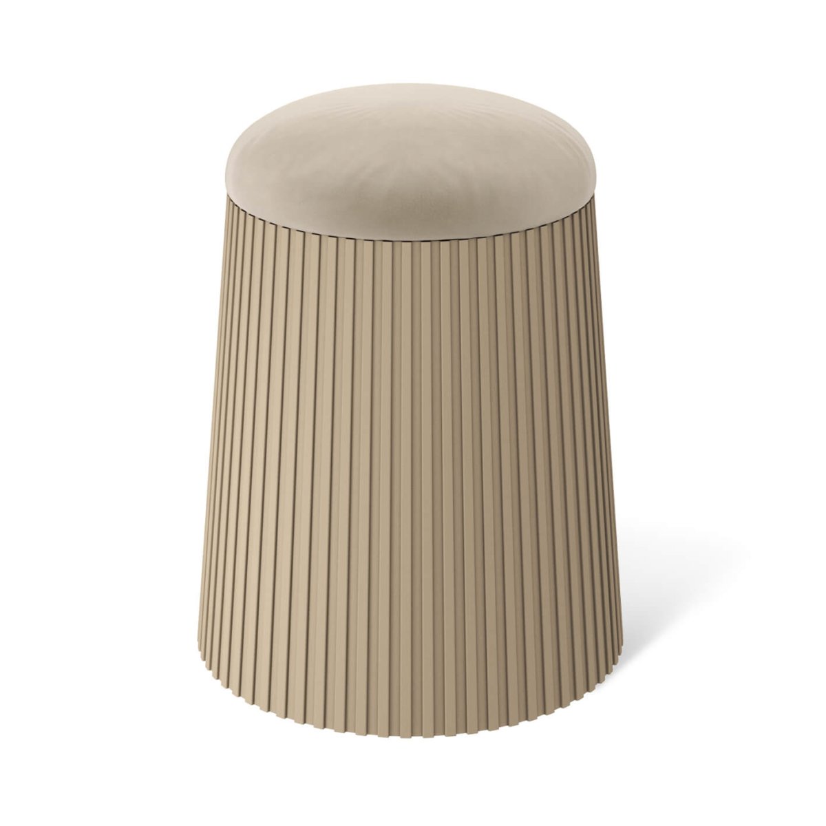 Сиденье пуфика выполнено из микровелюра, в качестве мягкого наполнителя используется поролон. Основание пуфа выполнено из полипропилена с армирующими добавками, за счёт чего повышается жесткость и надёжность изделия.