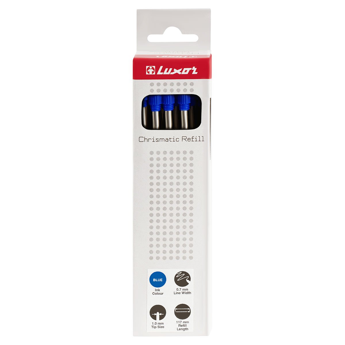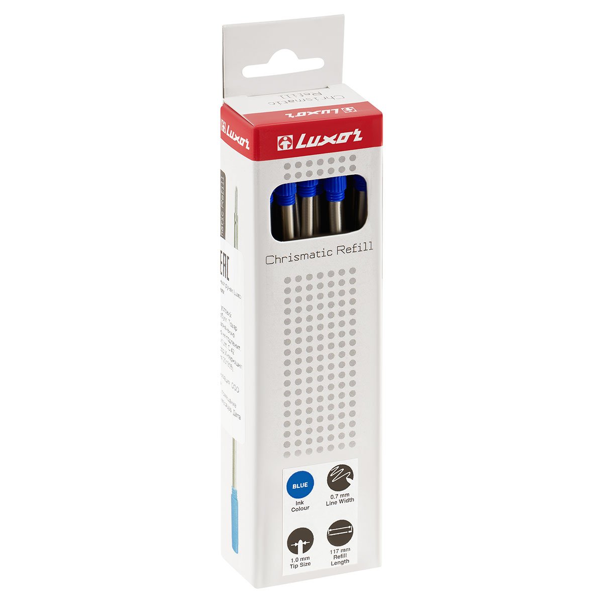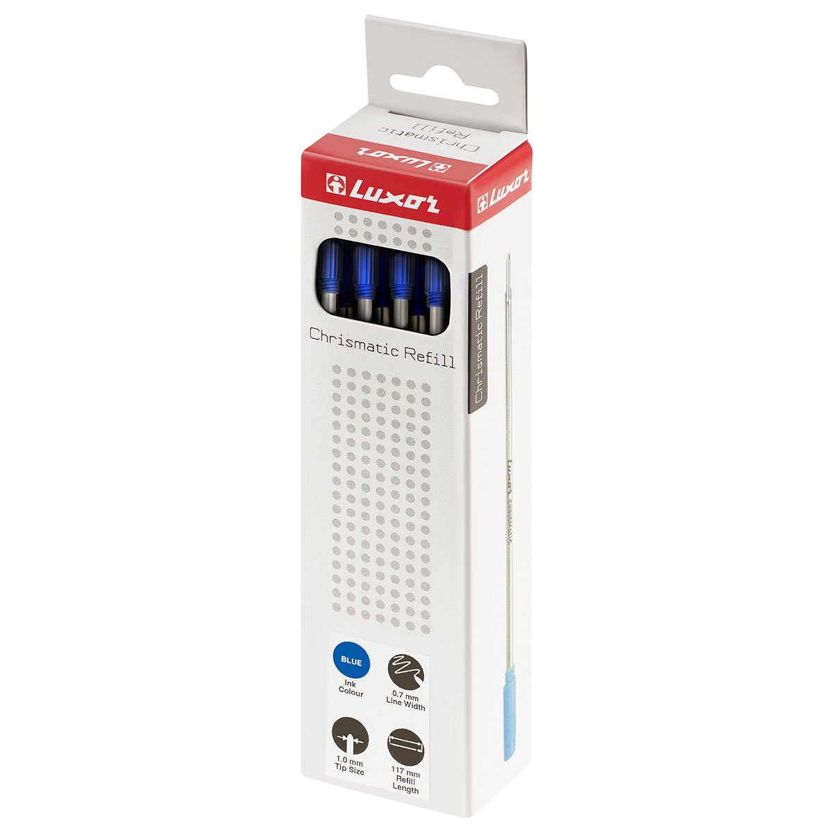 Объёмный стержень для шариковых ручек Luxor с поворотным механизмом. Цвет чернил – синий. Диаметр пишущего узла – 1 мм. Длина стержня составляет 117 мм. Длина письма может достигать 700 метров. Упакованы по 20 штук.